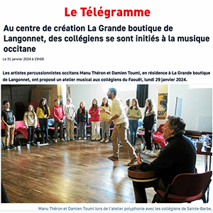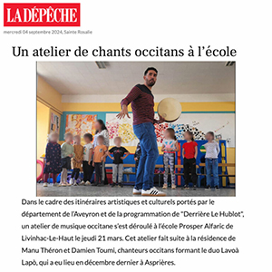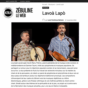Partis d’un répertoire indatable, qui balade l’Occitanie dans tous les recoins de leur fantaisie, ils échafaudent l’idée que deux chants et deux percussions peuvent dire, susciter et révéler. Leurs unissons charnels et précis explorent les mélodies traditionnelles pour en extraire les sucs et les restituer dans toute la saveur de leur étrangeté ; la polyrythmie patiemment élaborée se joue des cadres et des carrures imposées aux corpus traditionnels, en déréglant et en saturant des motifs inattendus ; la polyphonie emprunte aux passions méditerranéennes et infuse des harmonies gorgées d’une puissante chaleur ; enfin, la complémentarité des deux timbres est exaltée par la bouillonnement enivrant d’un chant-contrechant maîtrisé jusqu’à la prouesse.
